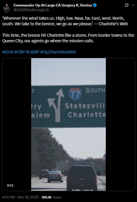 And like other DHS operations, DHS gave this operation an unserious, cutesy nickname: Operation Charlotte’s Web.1 The operation’s commander, Greg Bovino, even posted a quote from the children’s book Charlotte’s Web on X, along with a promise that DHS would “hit Charlotte like a storm.”2